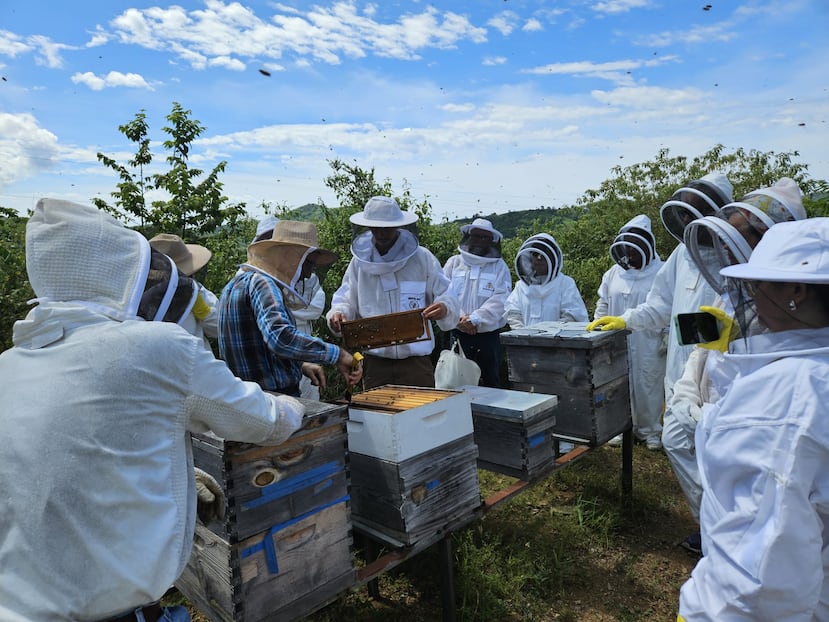 El sonido es lo primero que cambia. No es el del carro pasando por la autopista cercana ni el viento moviendo los árboles. Es un zumbido constante, colectivo, casi hipnótico. Estoy en el barrio Diego Hernández de Yauco, vestida con un mameluco blanco que me cubre de pies a cabeza, a punto de acercarme a miles de abejas.
