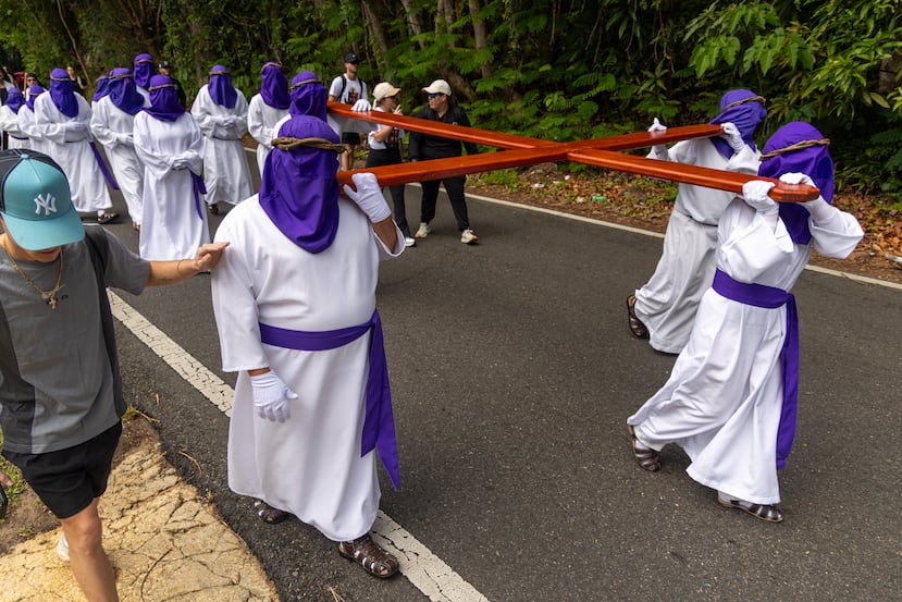 CAMUY - La cruz es la llave. Primero la cargan todos, una gran pieza de madera, escoltada por figuras de rostros ocultos hasta el punto de partida. Capuchas de púrpura cubren sus cabezas, coronadas con lianas enredadas, como si fueran espinas. Largas capas blancas visten sus cuerpos y sus manos cubiertas por guantes blancos sostienen el gran madero que pronto se usará para el gran sacrificio. Son los nazarenos, hombres y mujeres anónimos que cada año peregrinan junto a Jesús, el Cristo, camino al Calvario.