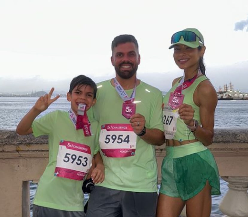 Alejandra Espinoza finaliza su primer 5K junto a su hijo y esposo en Puerto Rico