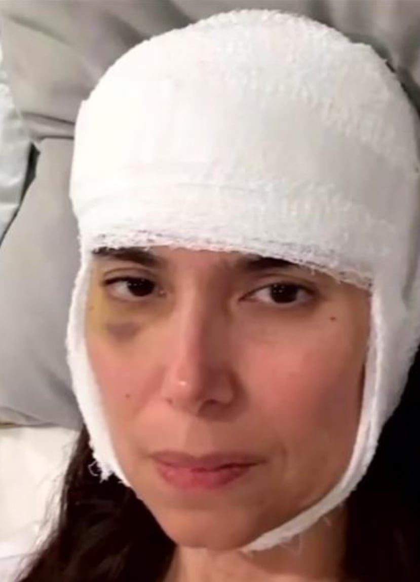 La actriz resultó con golpes en el rostro, un brazo roto y la cabeza vendada tras el accidente en su casa