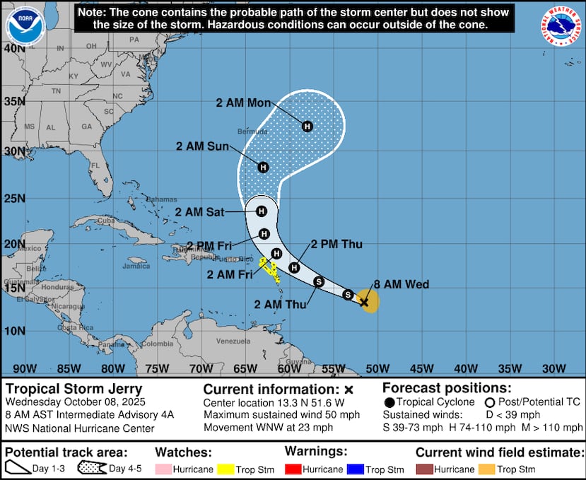 Por su parte, la meteórologa Cecille Villanueva, del Servicio Nacional de Meteorología (SNM) en San Juan, informó que el escenario más probable es que Jerry pase como un huracán al noreste de Puerto Rico.