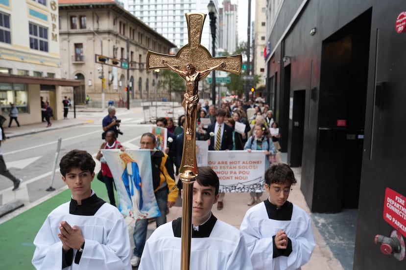 Los manifestantes recorrieron las calles del centro de la ciudad tras una misa bilingüe en la Iglesia Gesu, la parroquia católica más antigua de Miami, con pancartas como “¡No están solos!”, “Los refugiados e inmigrantes son bienvenidos aquí” y “Jesús era un refugiado y le diste la bienvenida”.