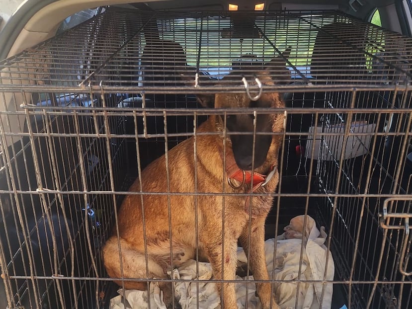 Allí encontró a un perro de la raza Belgian Malinois encadenado a un árbol, con muy poca movilidad y heridas en diferentes partes del cuerpo.