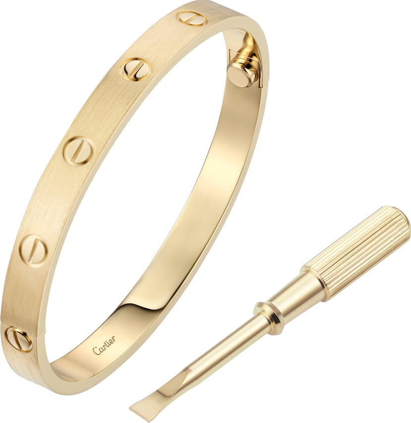 Más allá de su diseño, la pulsera Love es una pieza declarativa, una encarnación física de los sentimientos. El amor ya no es libre, sino que une a los amantes a través de una banda de oro llevada en la muñeca y que se cierra utilizando un destornillador específico. Esta pulsera es como unas esposas preciosas, ya que se necesitan dos personas para asegurar los tornillos. Al usarla, cada pareja puede proclamar su amor el uno por el otro para que todos lo vean.